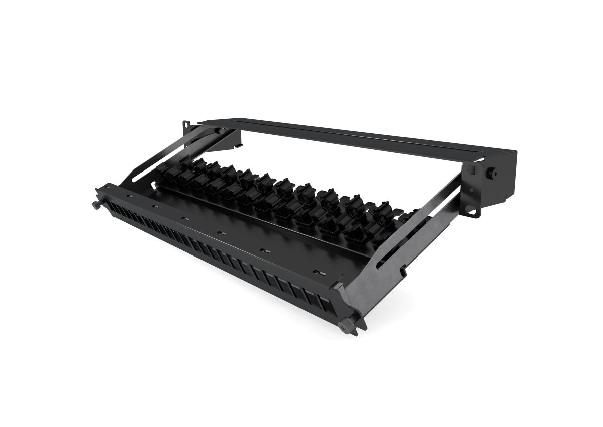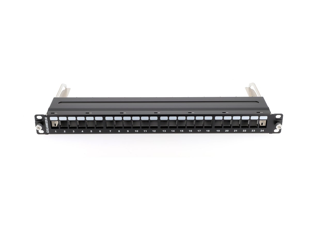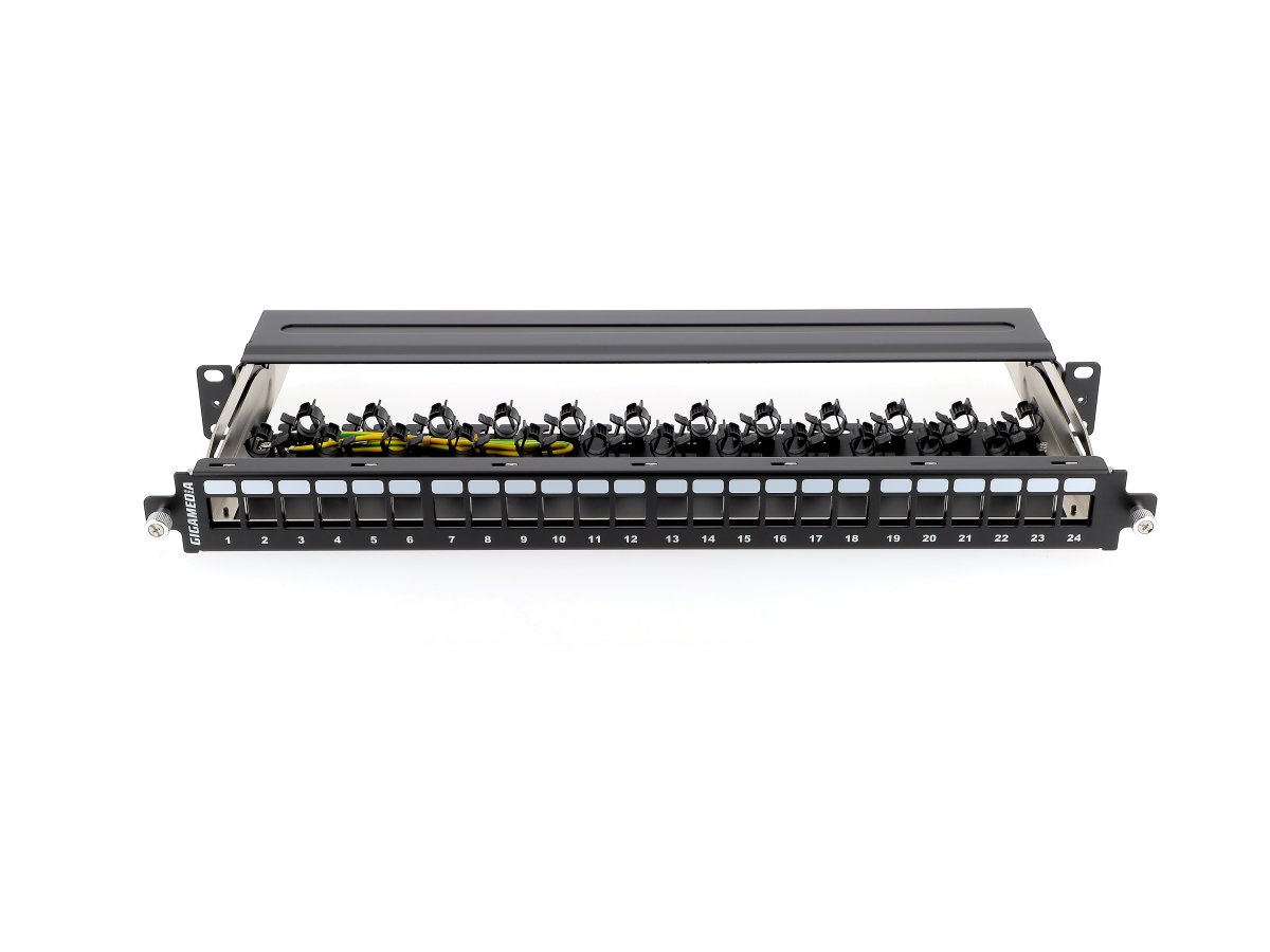 Utdragbar obestyckad patchpanel för 24 st skärmade eller oskärmade Gigamedia modularjack RJ45. Hålbild Keystone, passar alla Gigamedias jack. Fronten har fast portmärkning 1-24 samt plats för egen märkning. Panelens utdragbara del kan enkelt lossas med två tumskruvar så att man kan dra ut den och vinkla den nedåt där den stannar i en perfekt position för att jobba fritt med kablar och jack. Baktill på den utdragbara delen sitter ett innovativt kabelstödsystem med smarta snabbfästen som passar alla kablar oavsett dimension. Jordkabel för skärmanslutning medföljer.