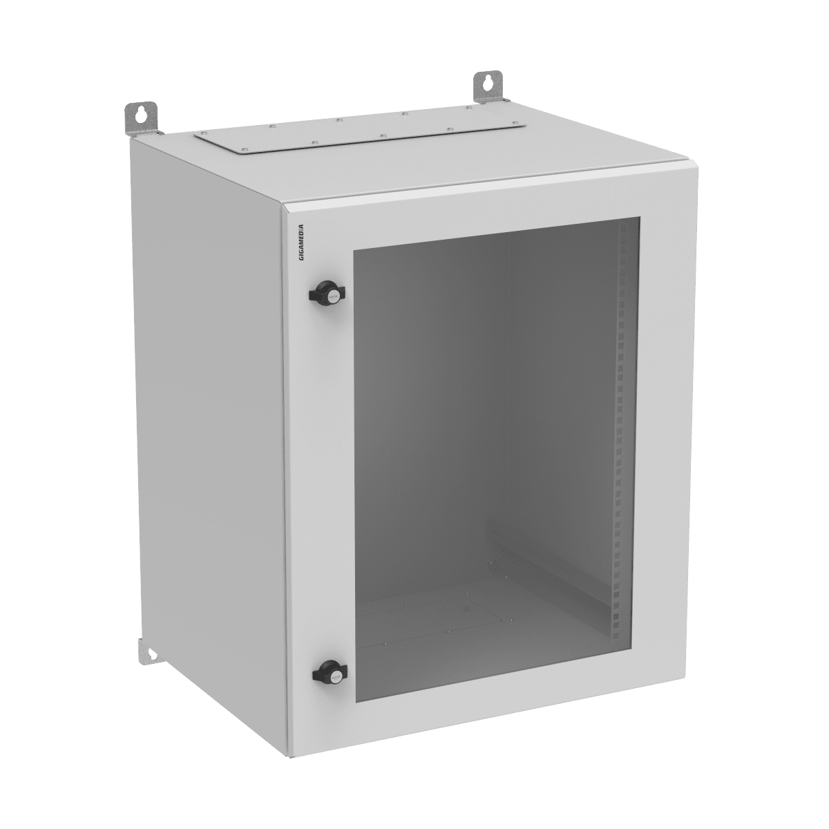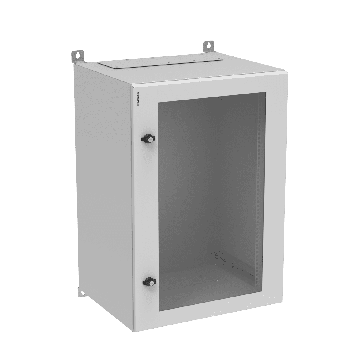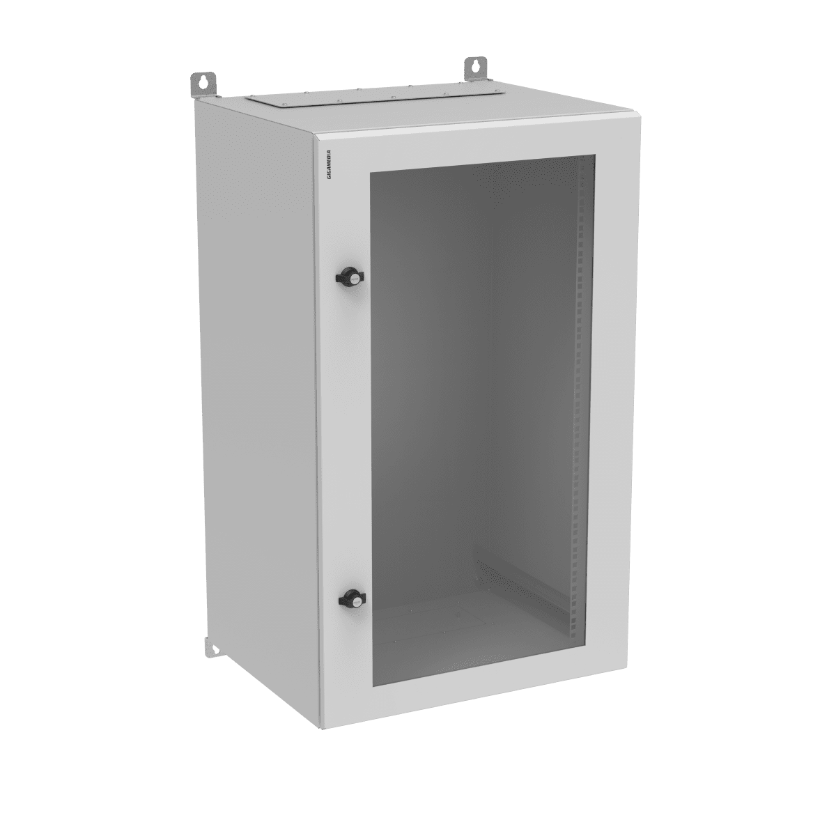 En serie mycket gedigna IP55-klassade väggskåp tillverkade av helsvetsad pulverlackerad plåt. Dörr med integrerad glasruta. Finns i olika höjder från 6HE till 21HE (höjdenheter) Dörren, som kan vändas åt valfritt håll, kan öppnas 180 grader. 19-tumsskenorna är justerbara i djupled. Kabelgenomföringar finns i skåpens tak och botten, täckta av en tunnare plåt i vilken man monterar valfria kabelförskruvningar (ingår ej). Fyra monteringsbeslag samt jordningskit ingår. Som tillbehör finns stolpfäste E2504167 för montering på stolpe 150 - 250mm. Skåpen är avsedda för användning inomhus.
