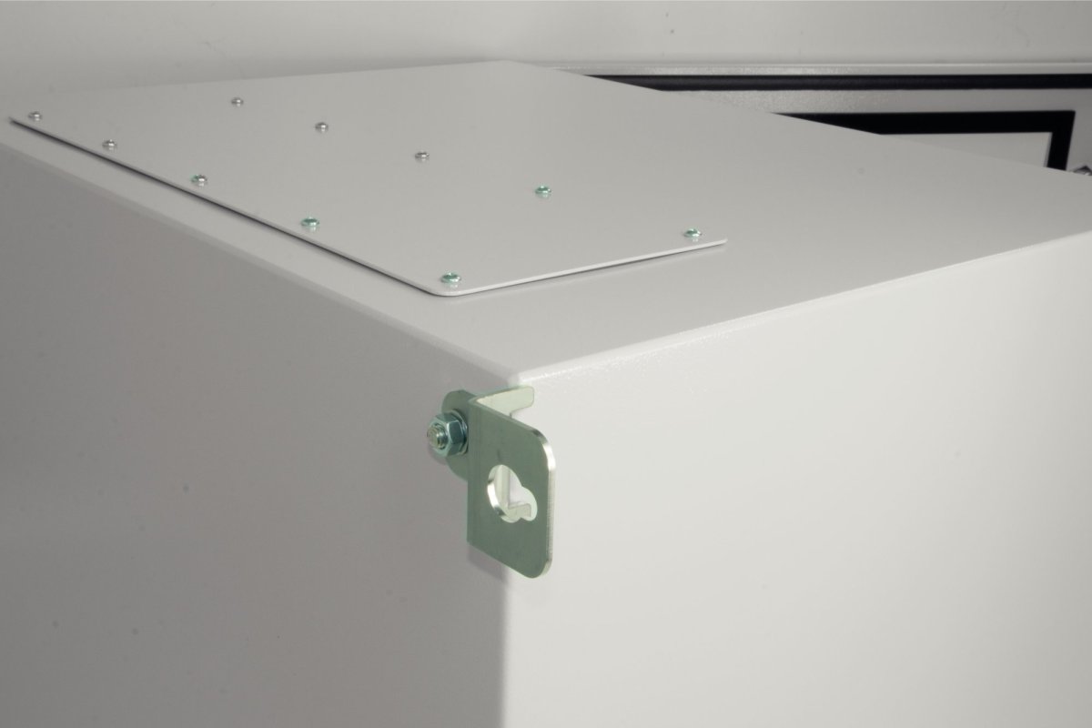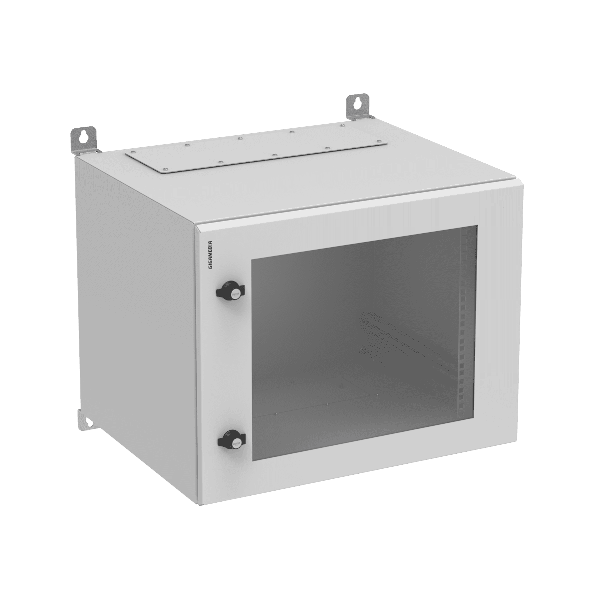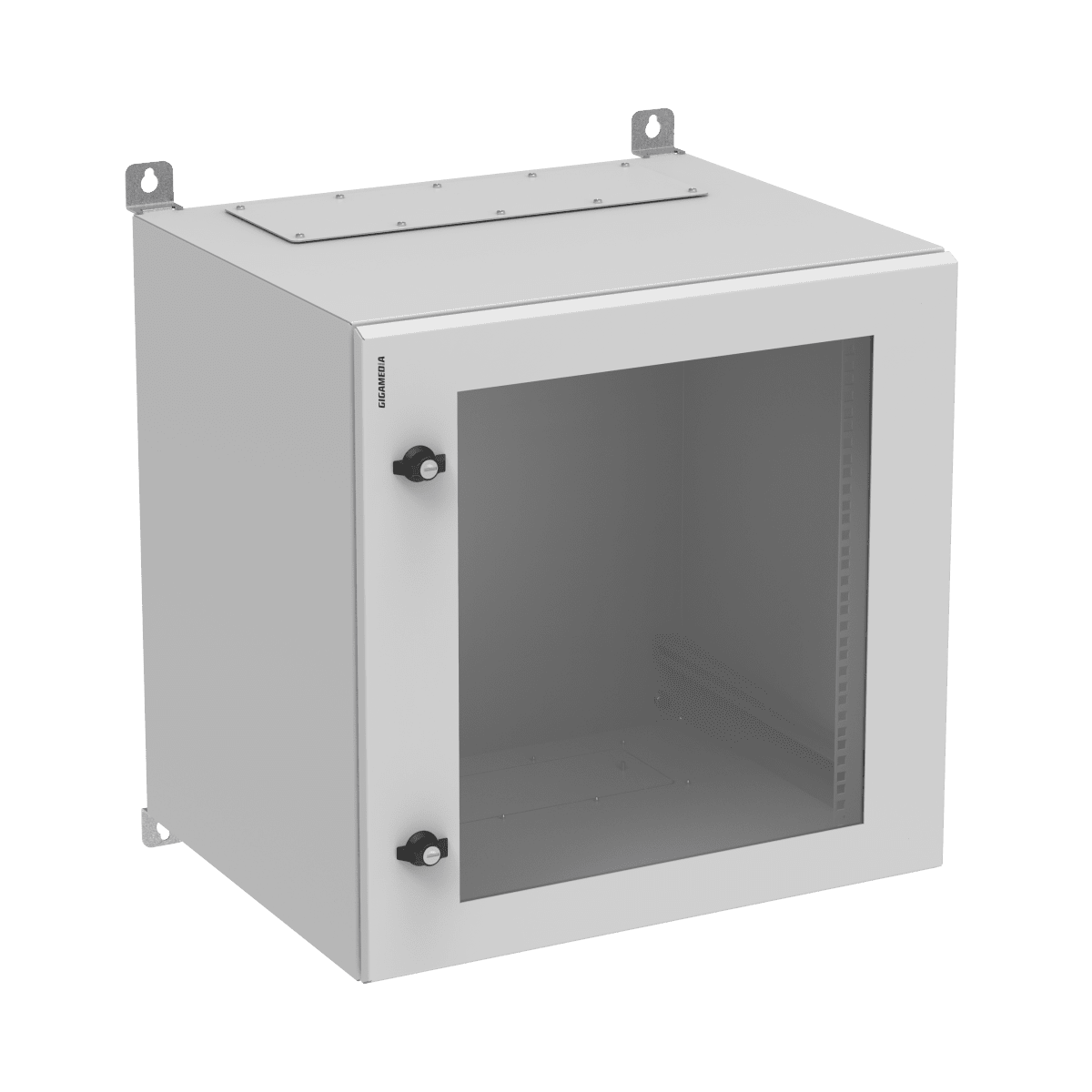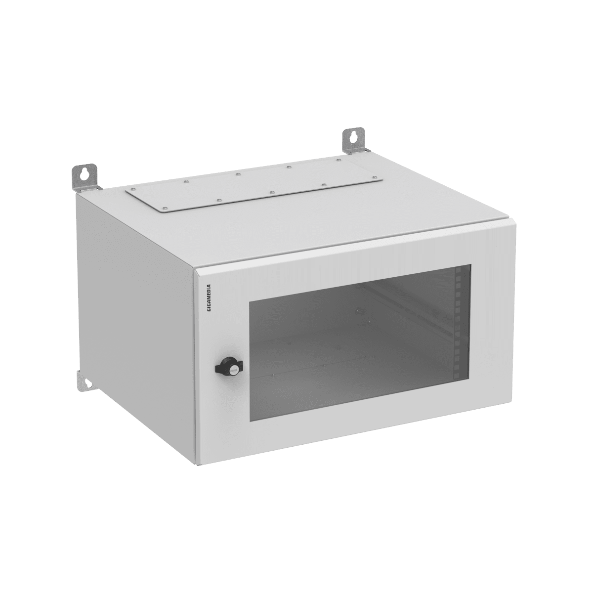 En serie mycket gedigna IP55-klassade väggskåp tillverkade av helsvetsad pulverlackerad plåt. Dörr med integrerad glasruta. Finns i olika höjder från 6HE till 21HE (höjdenheter) Dörren, som kan vändas åt valfritt håll, kan öppnas 180 grader. 19-tumsskenorna är justerbara i djupled. Kabelgenomföringar finns i skåpens tak och botten, täckta av en tunnare plåt i vilken man monterar valfria kabelförskruvningar (ingår ej). Fyra monteringsbeslag samt jordningskit ingår. Som tillbehör finns stolpfäste E2504167 för montering på stolpe 150 - 250mm. Skåpen är avsedda för användning inomhus.