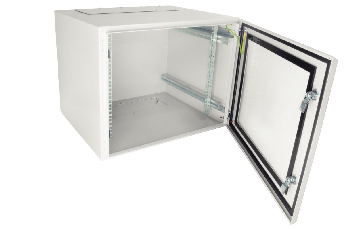 En serie mycket gedigna IP55-klassade väggskåp tillverkade av helsvetsad pulverlackerad plåt. Heltäckande plåtdörr. Finns i olika höjder från 6HE till 21HE (höjdenheter). Dörren, som kan vändas åt valfritt håll, kan öppnas 180 grader. 19-tumsskenorna är justerbara i djupled. Kabelgenomföringar finns i skåpens tak och botten, täckta av en tunnare plåt i vilken man monterar valfria kabelförskruvningar (ingår ej). Fyra monteringsbeslag samt jordningskit ingår. Som tillbehör finns stolpfäste E2504167 för montering på stolpe 150 - 250mm. Skåpen är avsedda för användning inomhus.